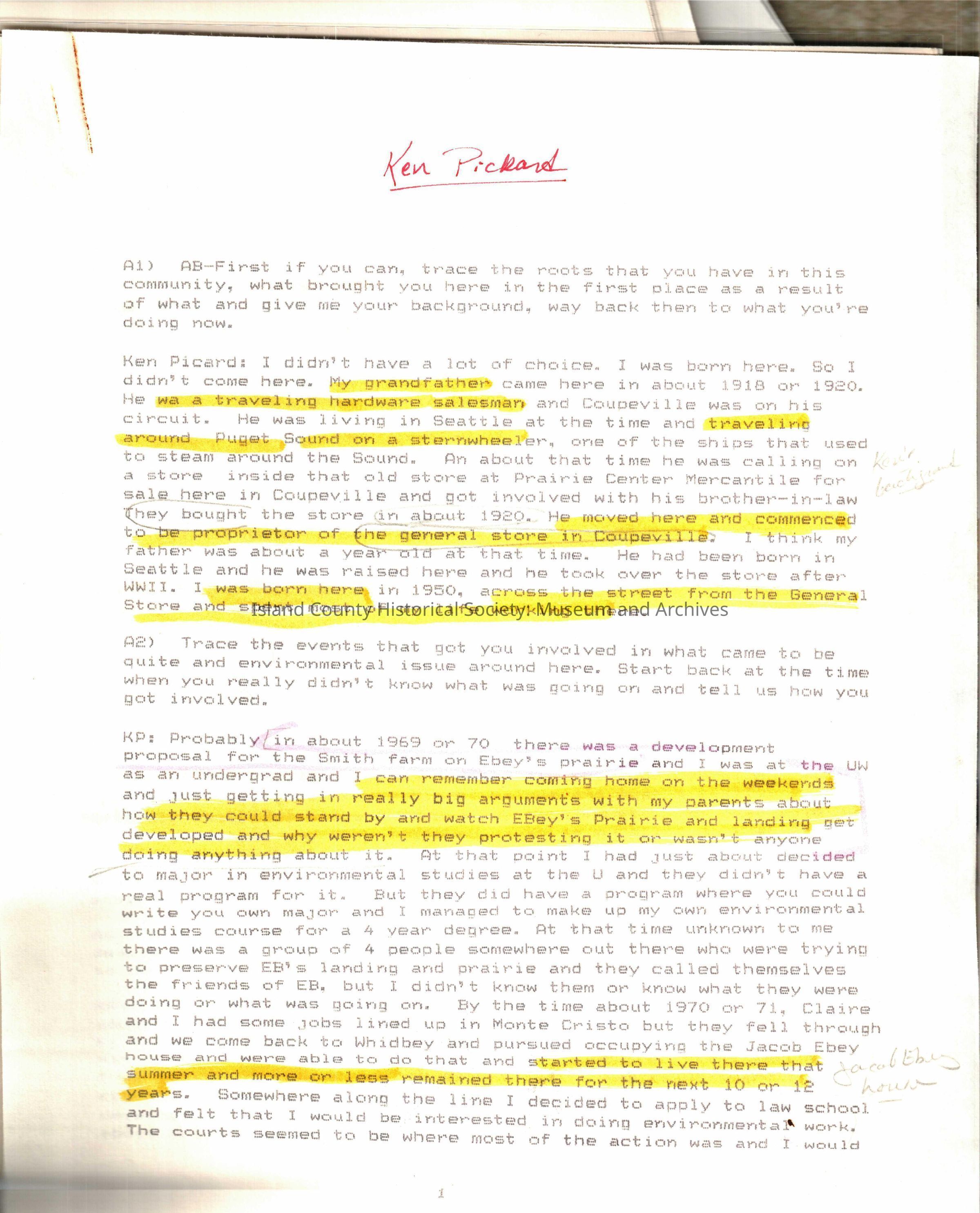 Oral history given by Ken Pickard describing his roots and his family's roots on Whidbey Island. Foscuses specifically on Ebey's Prairie and Ebey's Landing. In the interview Ken Pickard talks about the struggles and legal battles that he and his wife, Claire, went through to fight for and preserve Ebey's Prairie. The struggles in the interview refer to family, community, and legal battles. There is also a description and brief history of the Jacob Ebey house, where Pickard and his wife lived for 10-12 years. The end of the interview relates to other environmental projects that Ken Pickard and his team have worked on.