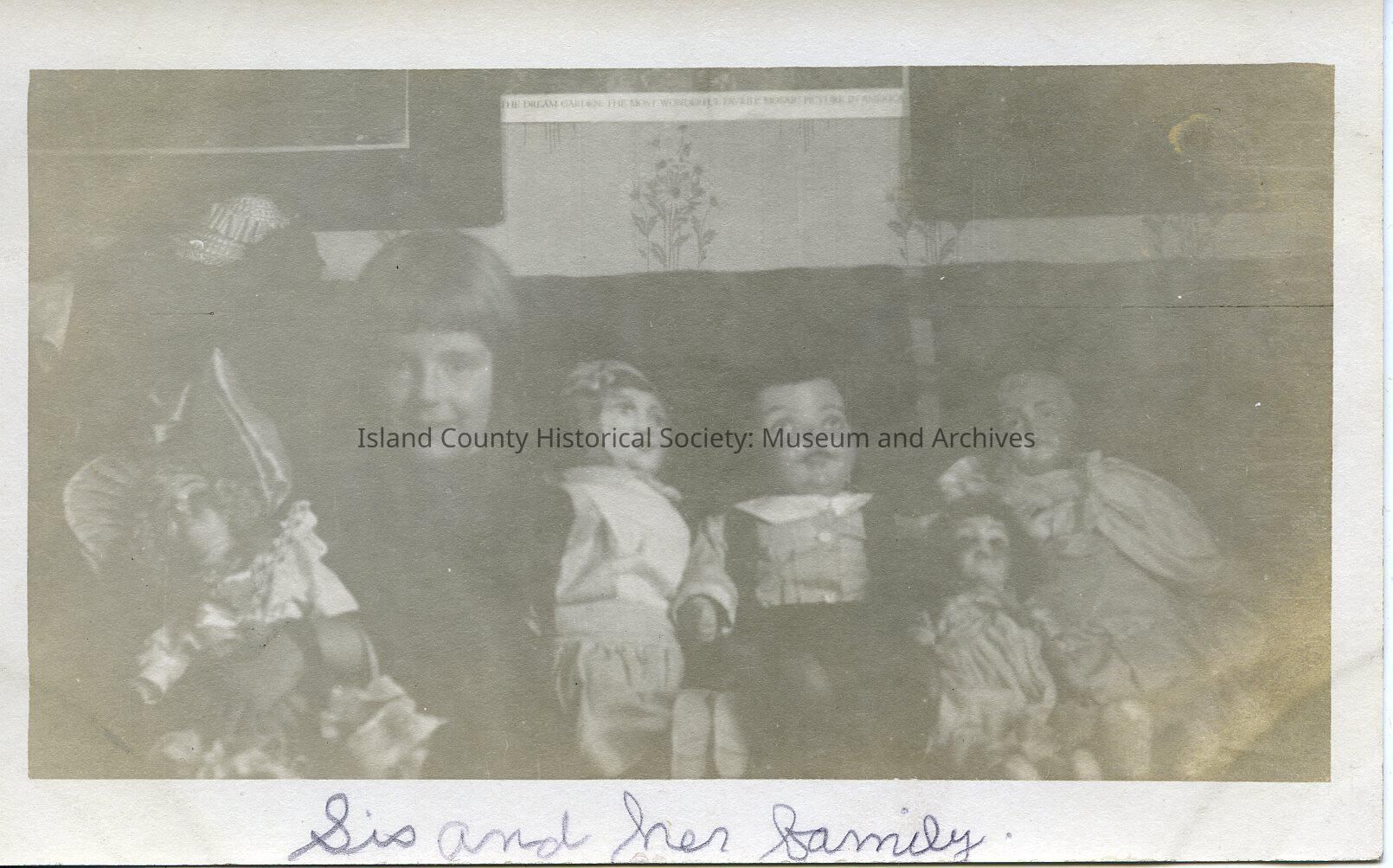 A photo of a young girl with dolls around her inside a home. Handwritten on the front is "Sis and her family." Handwritten on the back is "Phyllis."Made/Created