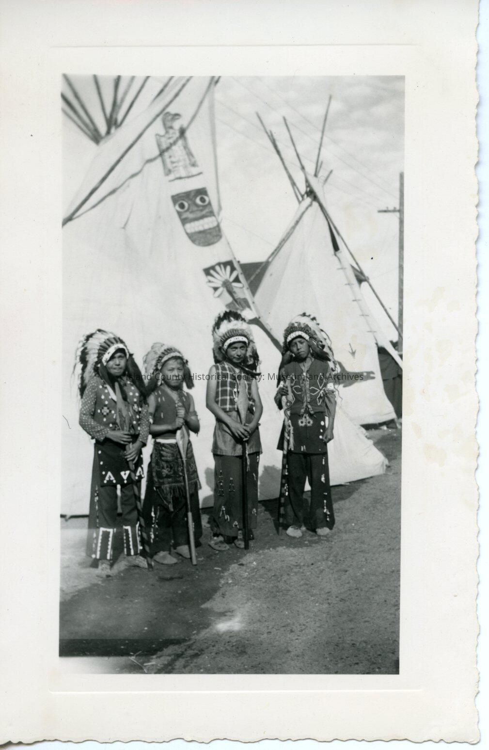 A negative of four Native American boys dressed in ceremonial garb standing in front of two teepees. They each hold a small spear with a triangular head.