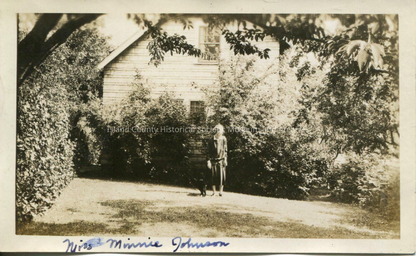 A black and white photo of the side of a house, trees, shrubs with a woman and a small dog. At the bottom: "Miss Minnie Johnson".