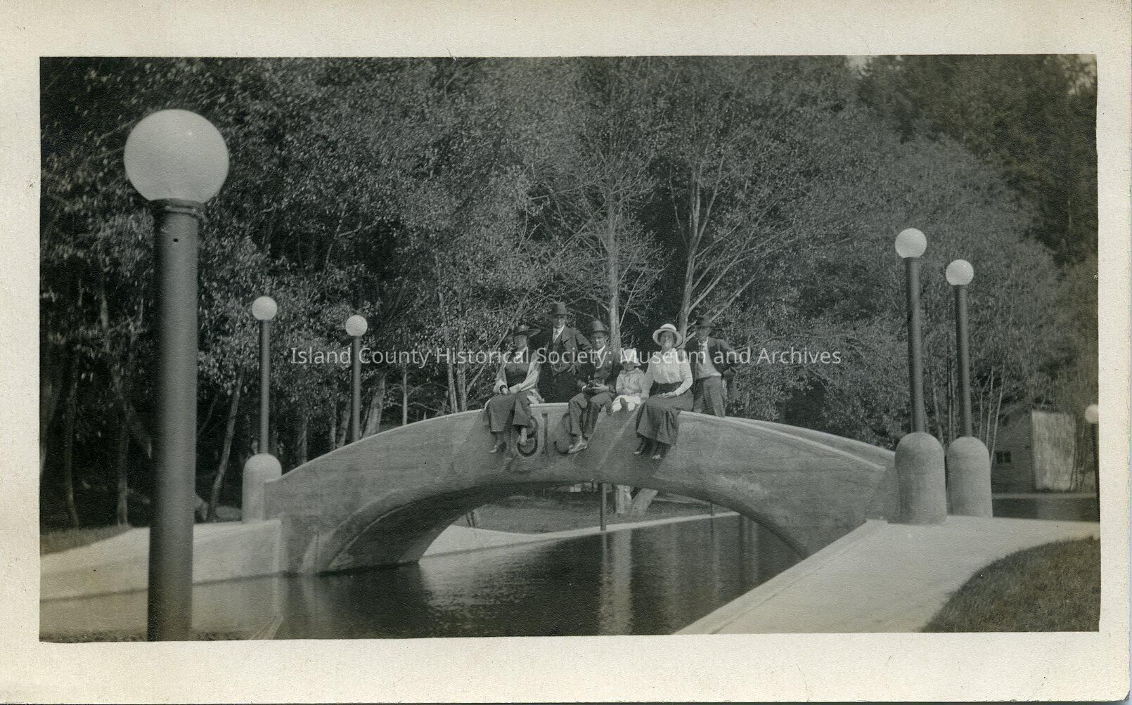 A photo of several people sitting on the edge of a bridge over water. Trees in the background. Looks like three men, two women and a child. Handwritten on the back is"From L. Little girl: Phyllis, Daisy, Harvey -"Made/Created