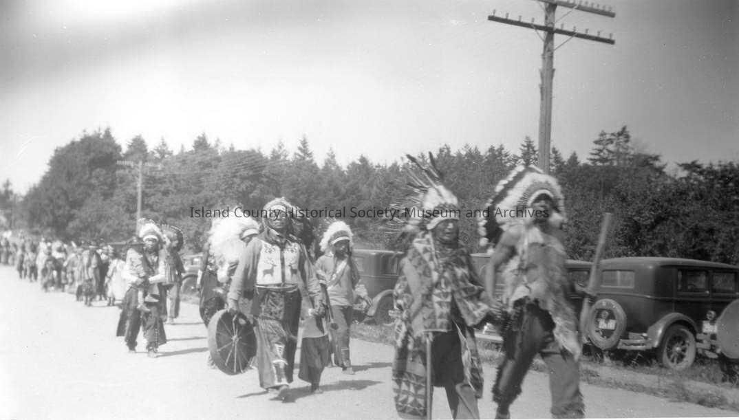 Black and white photograph showing the Parade at the Water Festival (1930s probably). A procession of Native American men and women (only adults visible) clad in traditional attire walk along a street (left to right of photo). Telephone poles, parked cars and trees along one side of the street. William Shelton can be seen in his beaded deer vest holding a drumCollection