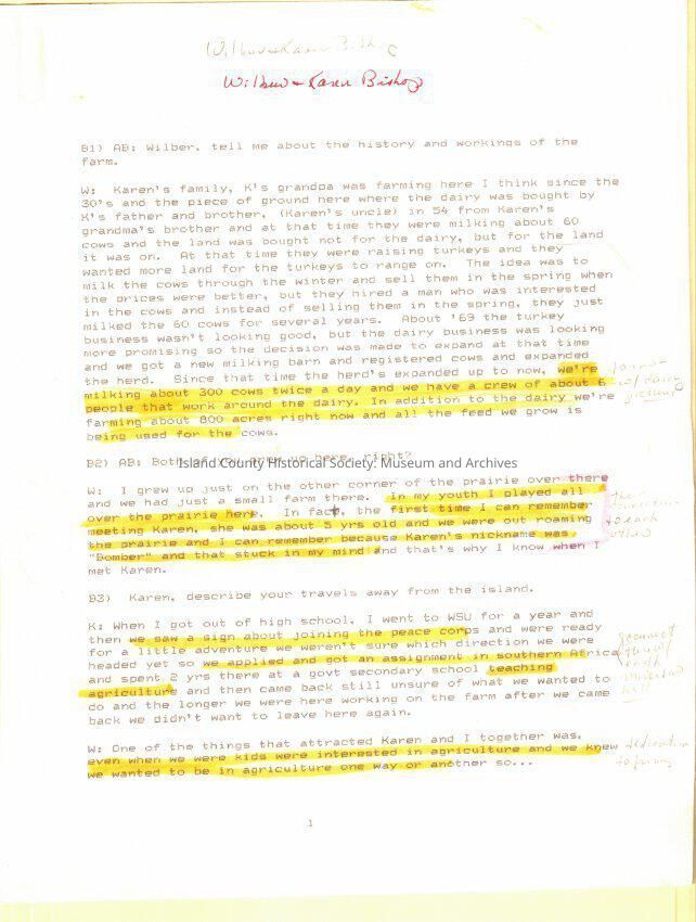 The interview talked about the Bishop dairy farm, history. They were in the Peace Corps in Africa. Talked about farming, practices, future of the industry. Wilbur was on the board of Ebey's Landing Reserve. Artifacts have been found on their farm: arrowheads, clay pots where Chinese residents lived. One of the 4 families in the Sherman Farms Corporation.