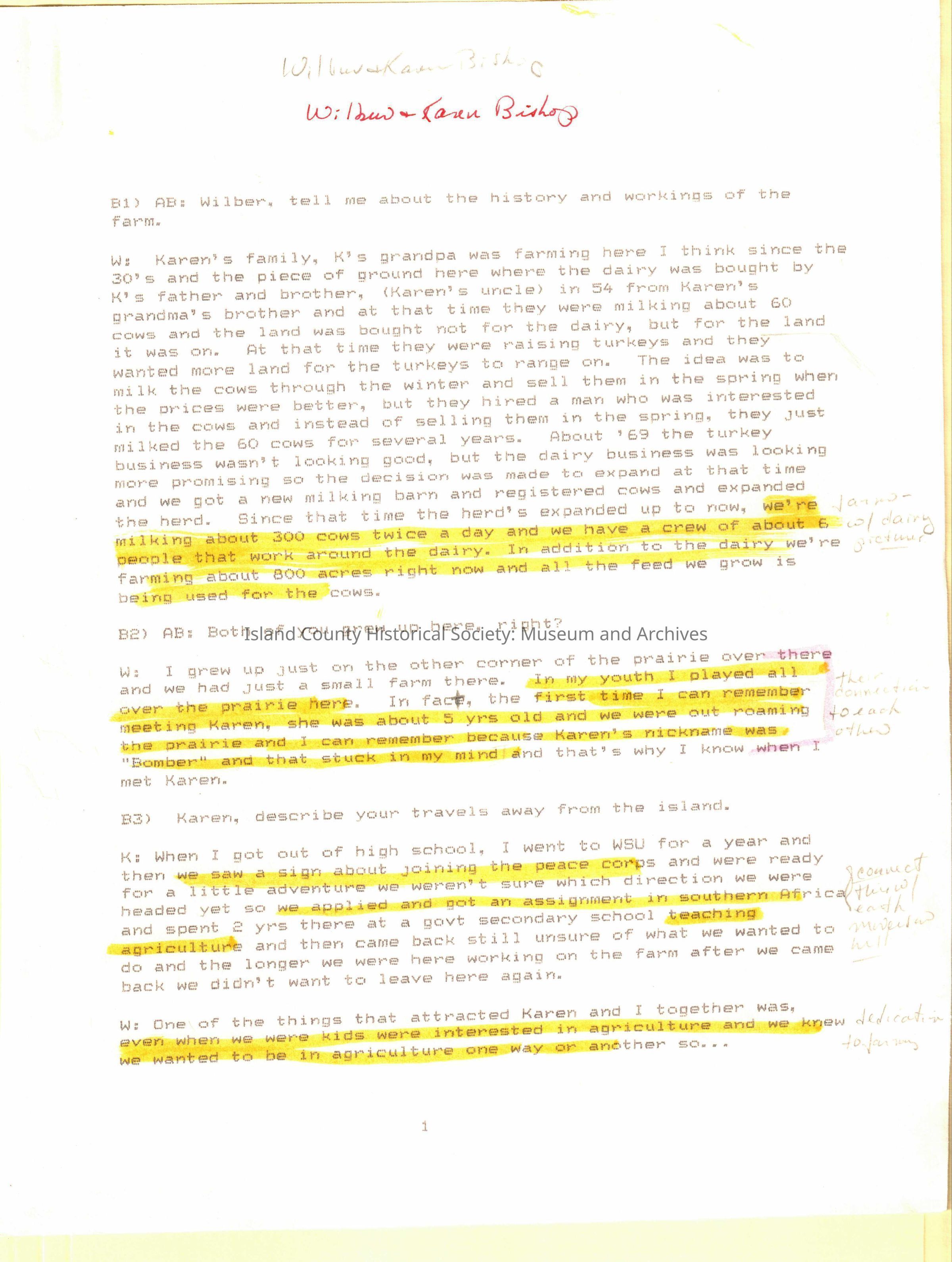 A transcript of an oral history by Wilbur and Karen Bishop .