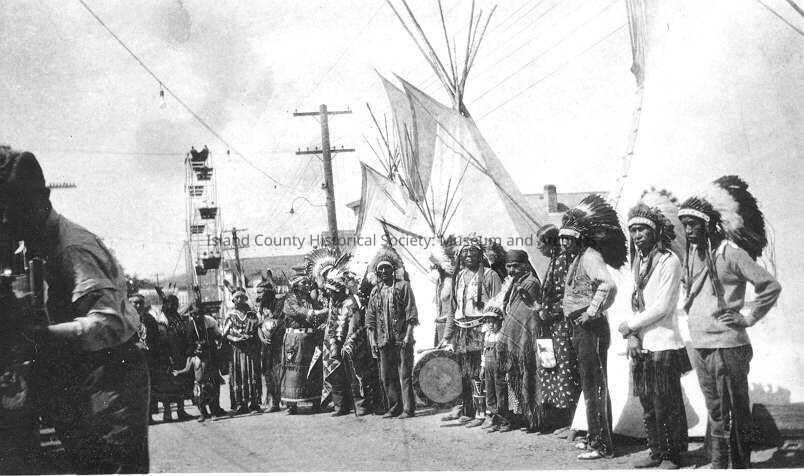 Black and white photograph of a group of Native Americans lined up in front of teepees at the 1933 water festival. A ferris wheel is in the background. Some men wear all their traditional ceremonial garb whilst others where more a combination of ceremonial items and everyday clothing.