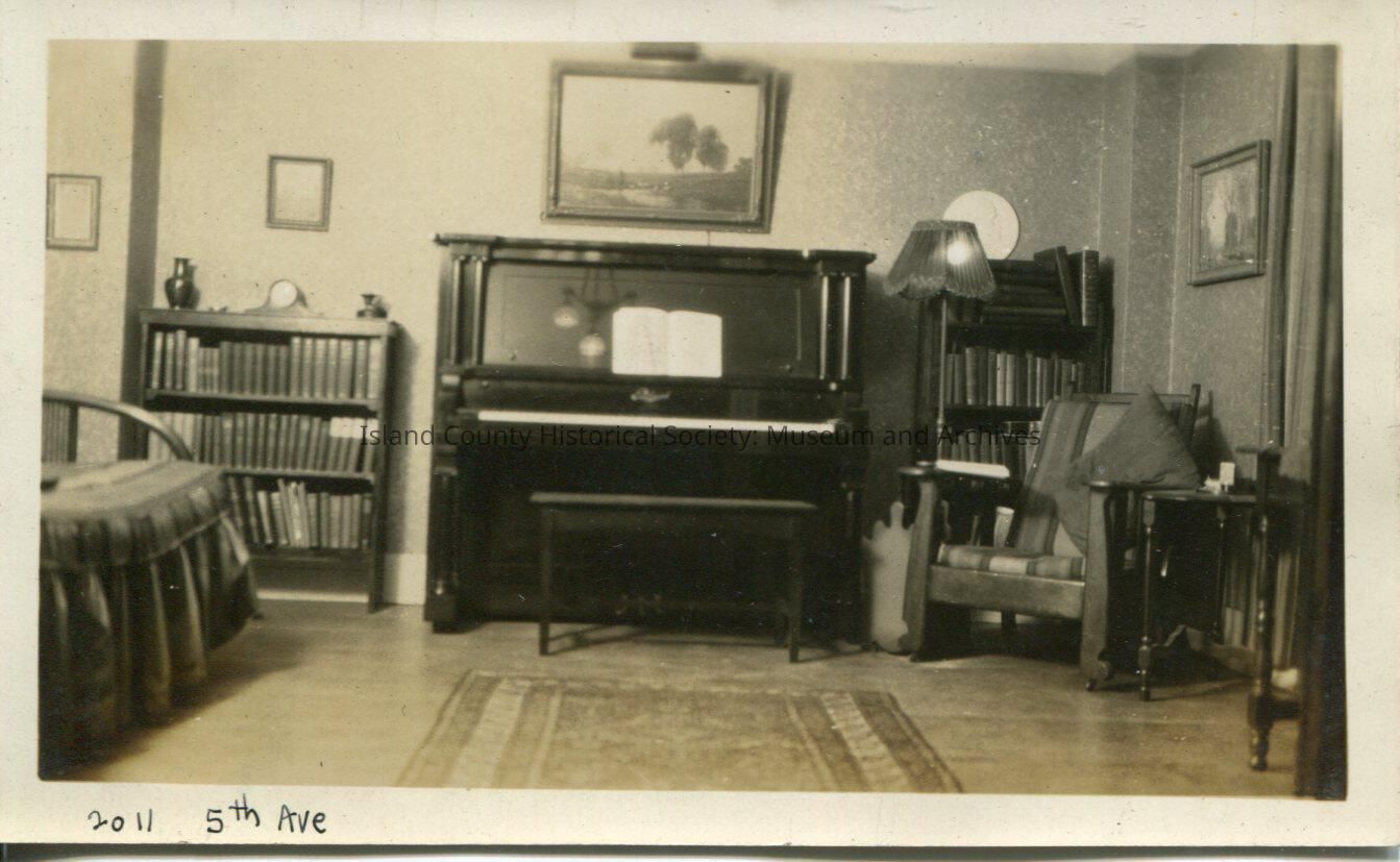 A black and white photo of a room with a piano and bench, rug, lamp, paintings or prints, a bed with striped cover, bookcase and books, wooden arm chair.
