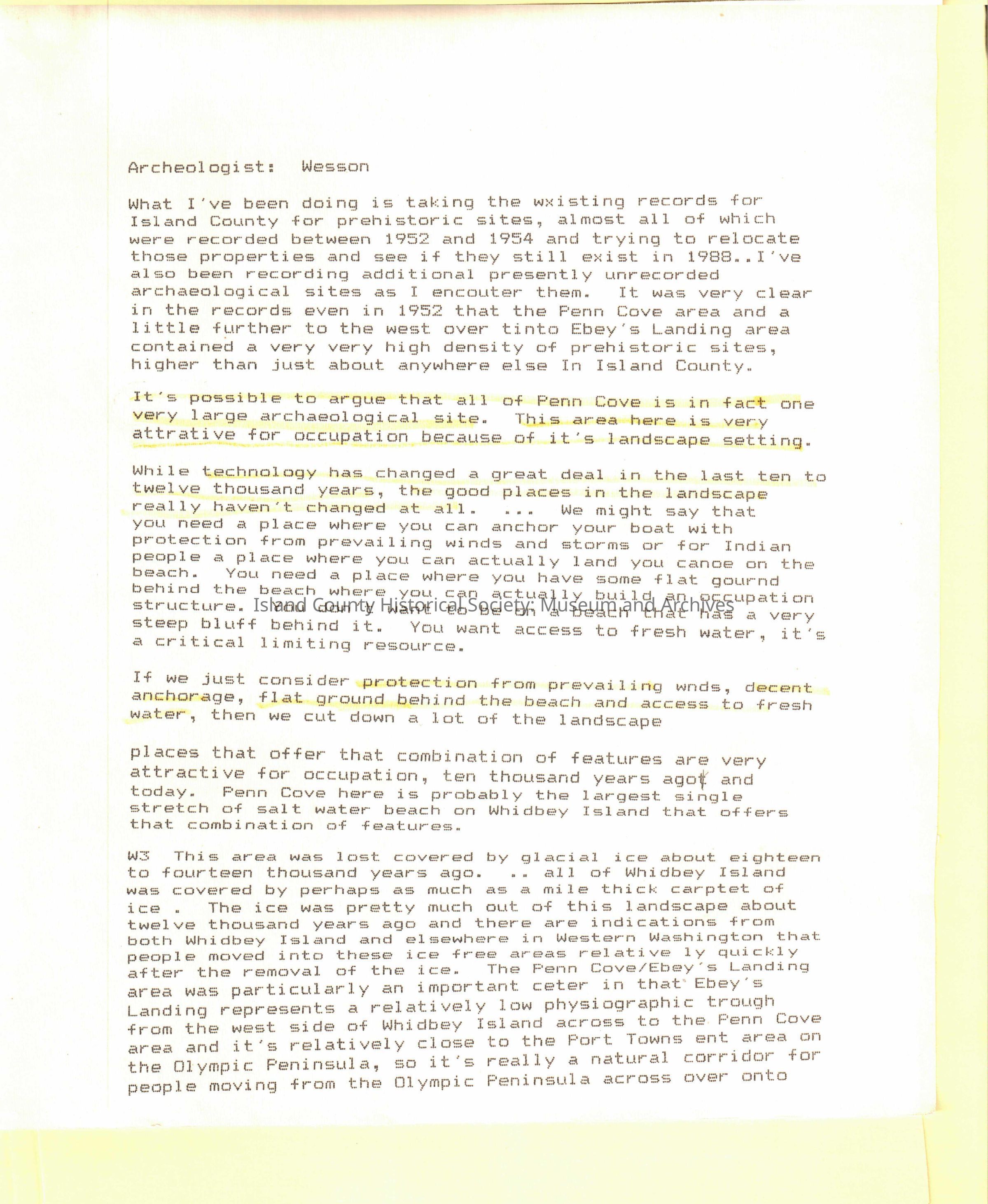 Wesson talked about various archaeological sites, geologic history of Penn Cove, trails, Indigenous/Native American houses and hunting. Europeans - farming, potatoes. Monroe's Landing - a mound of cultural material - probably cedar plank houses. Mentions Vancouver and Wilkes. Indigenous Treat 1855. Swinomish, Tulalip reservation, Clallams and Skagits.