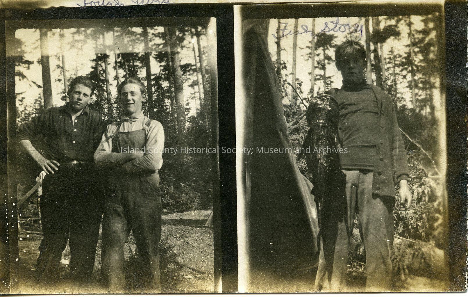 Two photos. Frist is two men, one with hand on hip, the other with his arms folded. The second photo is of one man holding a fish(?). Handwritten on the front is "Tough guys."Made/Created