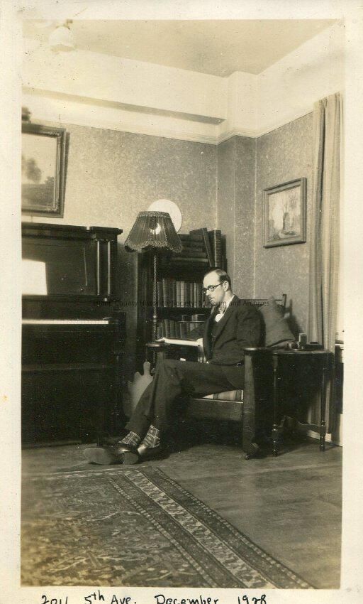 A black and white photo of a man sitting in a wooden arm chair reading a book, has a small mustache, glasses, suit, bow tie, patterened socks. The room has a rug, bookcase, paintings, lamp, piano and bench.