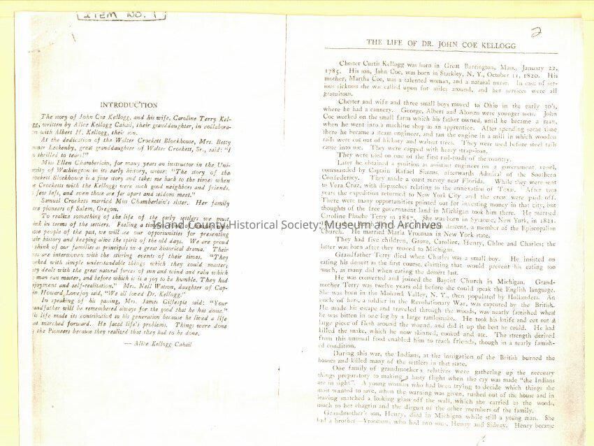 Photocopy of a booklet titled: "The Life of Dr. John Coe Kellogg"by Alice Kellogg Cahail, as told to her by Albert H. Kellogg. At the top, "Artie Osetling"(not sure of spelling) is written in blue ink.