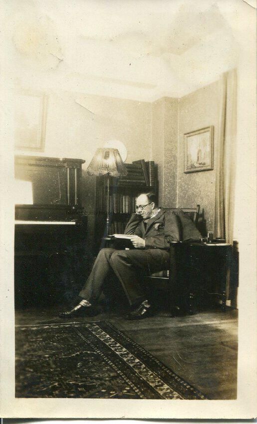 A black and white photo of a man sitting in a wooden arm chair reading a book, has a small mustache, glasses, suit, bow tie, patterened socks. His right arm is raised and he is holding the book with his left. The room has a rug, bookcase, paintings, lamp, piano and bench.