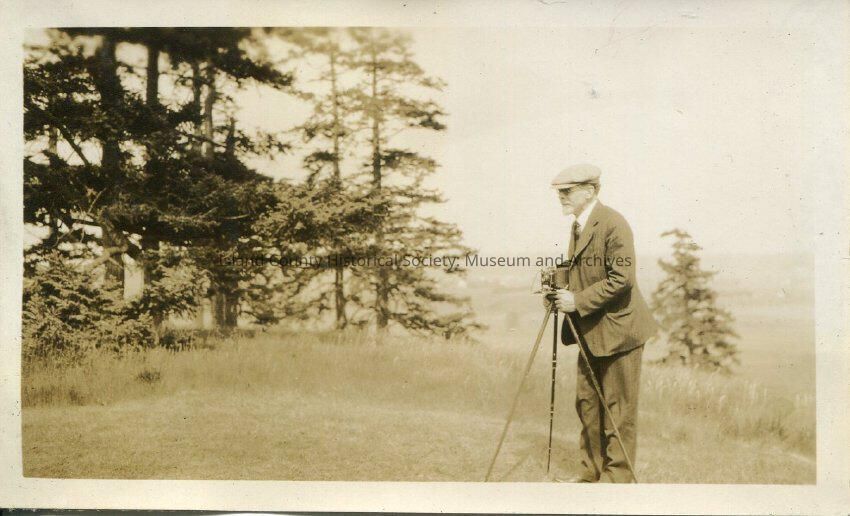 A black and white photo of an older man witih a tripod and camer set up onthe ground. Long grass, trees. He is wearing a suit and flat cap. Has a beard.