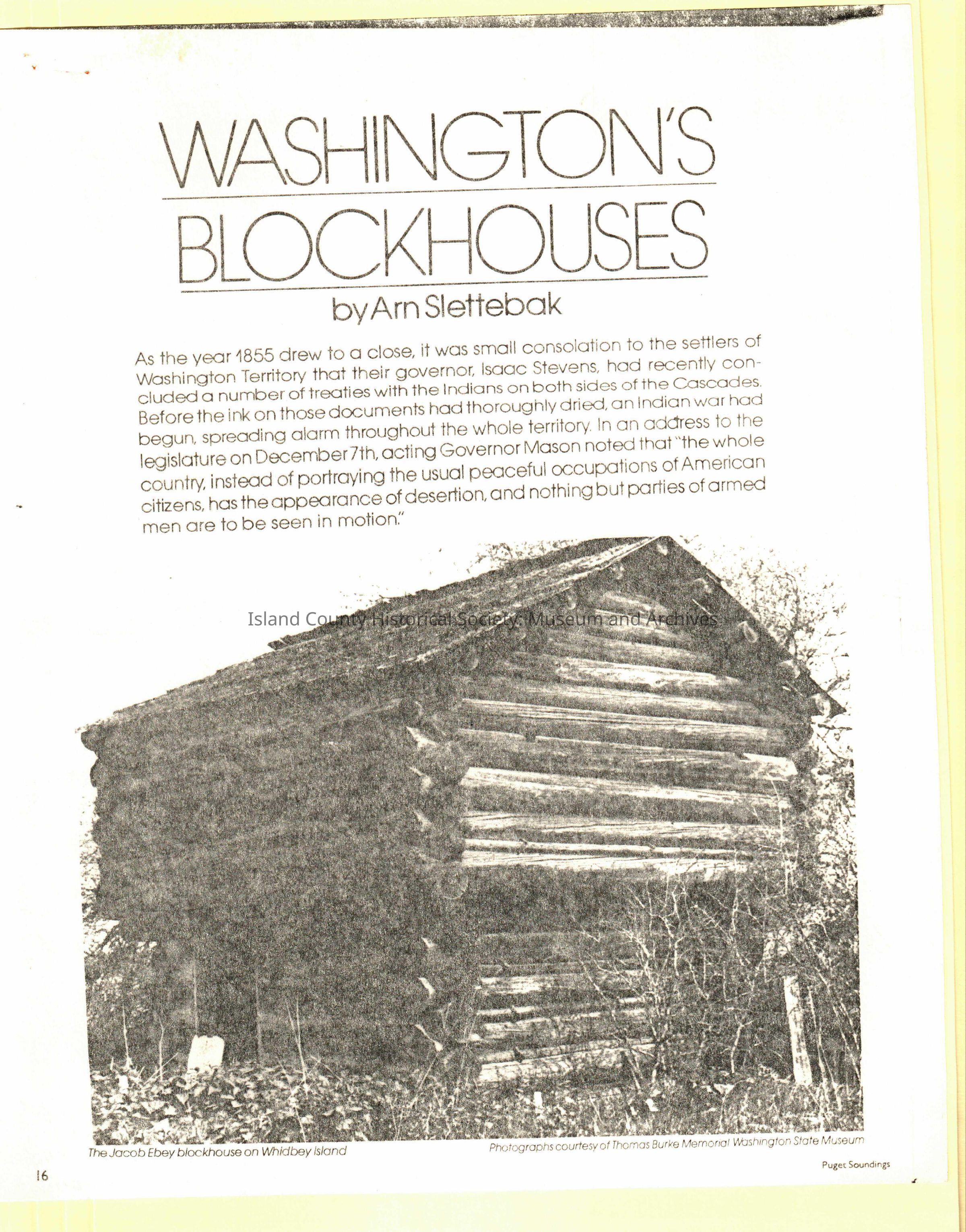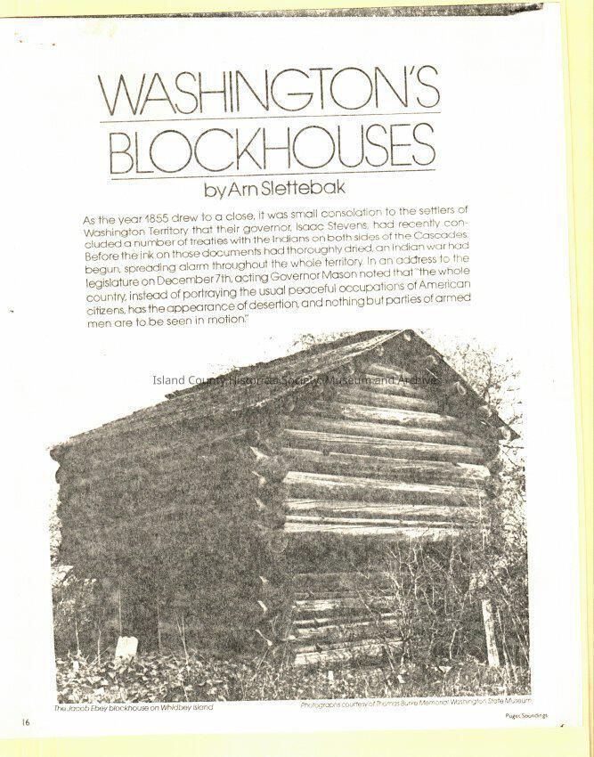 Article: "Washington's Blockhouses"by Arn Slettebak. Mentions Jacob Ebey Blockhouse, James Davis Blockhouse, Alexander and Crockett blockhouses on page 17. A photo of Ebey's blockhouse is on page 16.