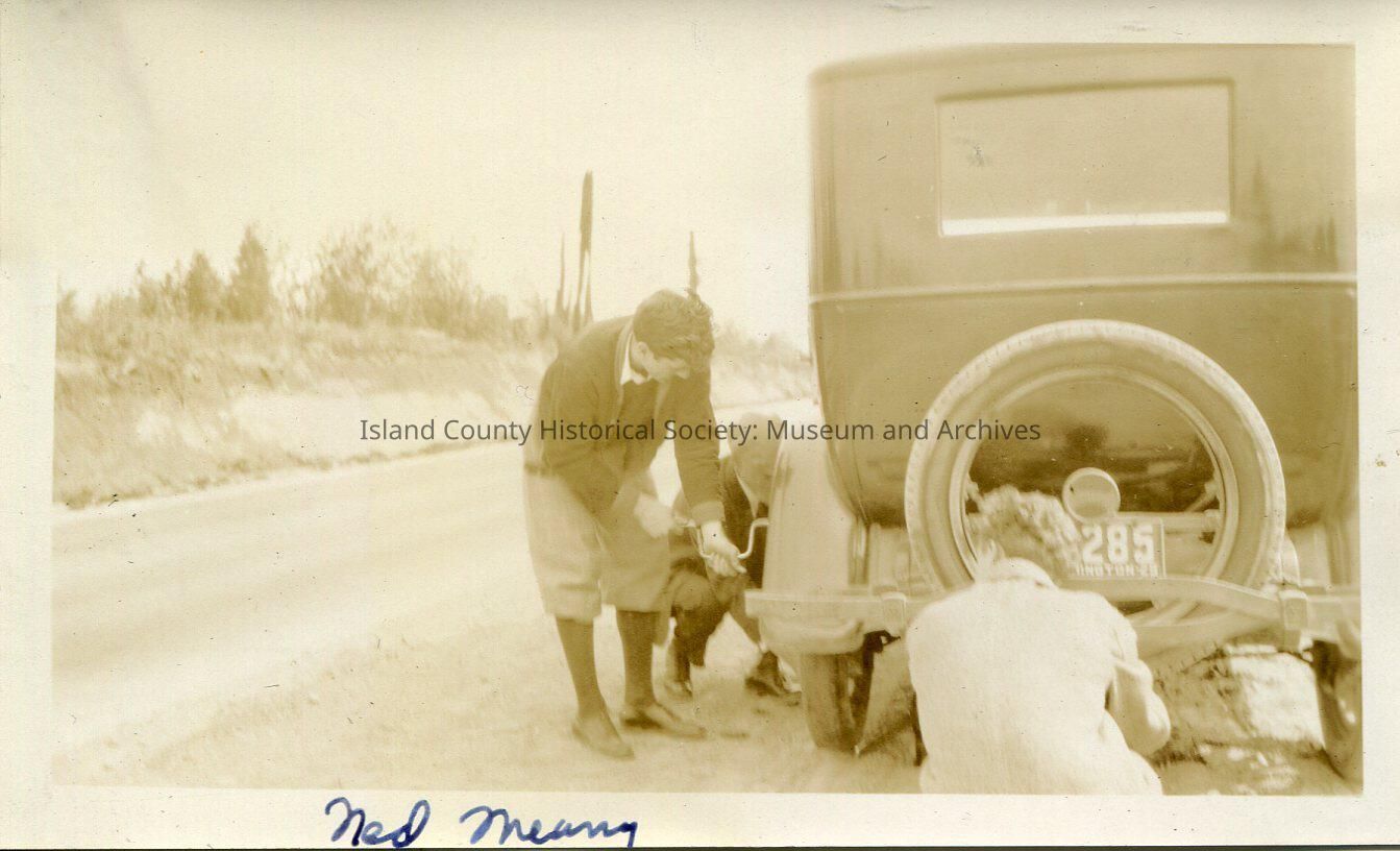 A black and white photo of a man changing the tire on a car while an older man helps and probably a woman watches - sitting on the dirt road behind the car. Th eolder man is wearing a suit and a flat cap, the younger a jacket, short trousers. The car has a washington tag. On the bottom: "Ned Meany"