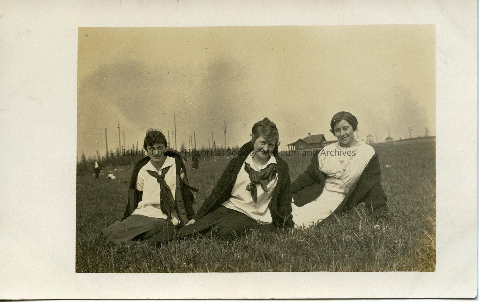 A photo of three women sitting down on a grassy place below a home. Some smudges are on the sky area.Made/Created