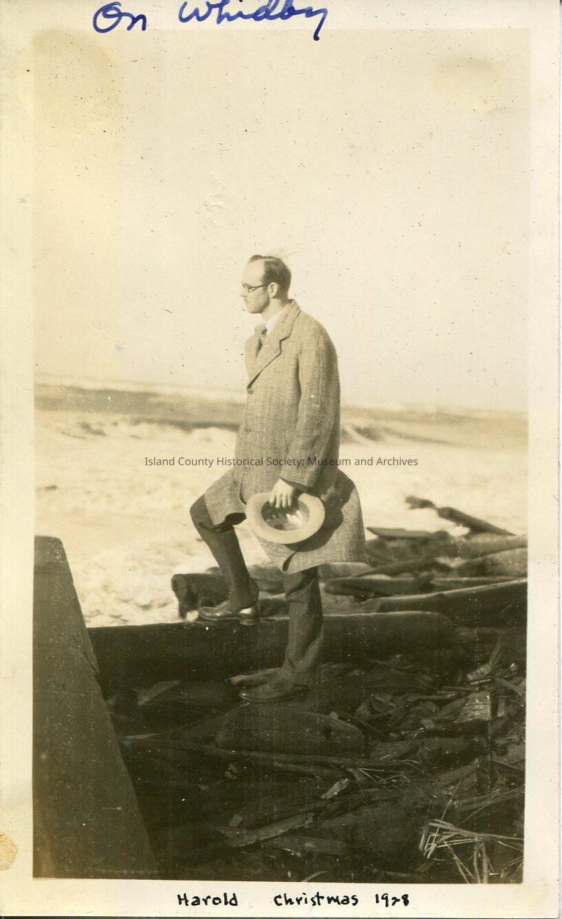 A black and white photo of a man at the beach, with one foot on driftwood. Holding a hat. Wearing coat, has glasses, has a small mustache. On top: "On Whidby (sic)" and on bottom: "Harold Christmas 1928"