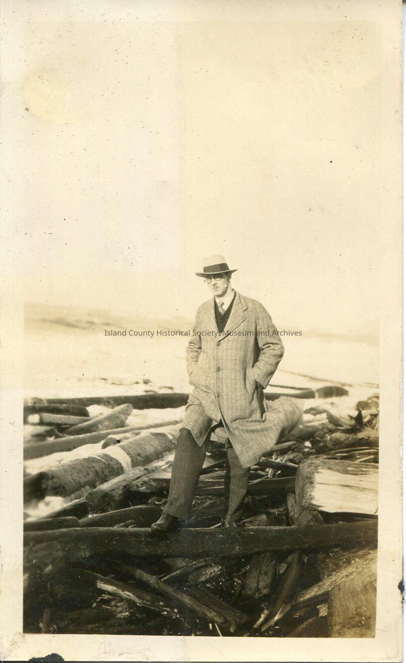 A black and white photo of a man at the beach, standing on driftwood. Wearing a hat, coat, has glasses. hands in his pockets. Has a small mustache. Harold Eugene Kellogg Same man different pose in 2015.074.230. Related to 2015.074.235.