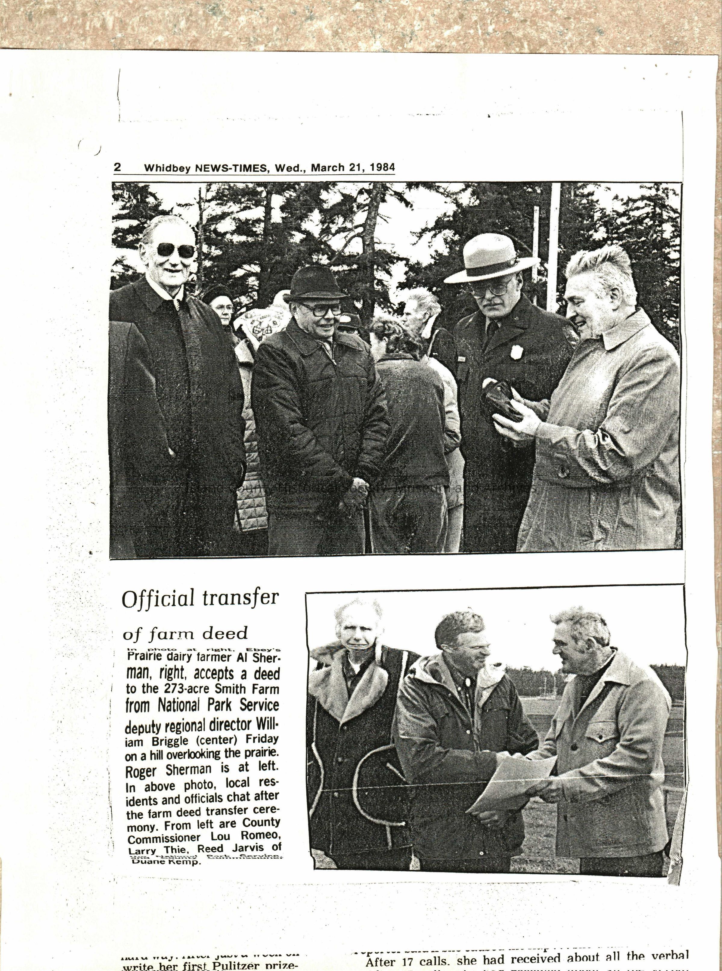 An article from Whidbey News-Times. "Official Transfer of Farm Deed". There are two photos on the one-page clipping. The top photo is mainly of four people chatting after the farm deed transfer ceremony. The bottom photo is of Al Sherman accepting the deed to the Smith Farm from National Park Service deputy regional director William Briggle.