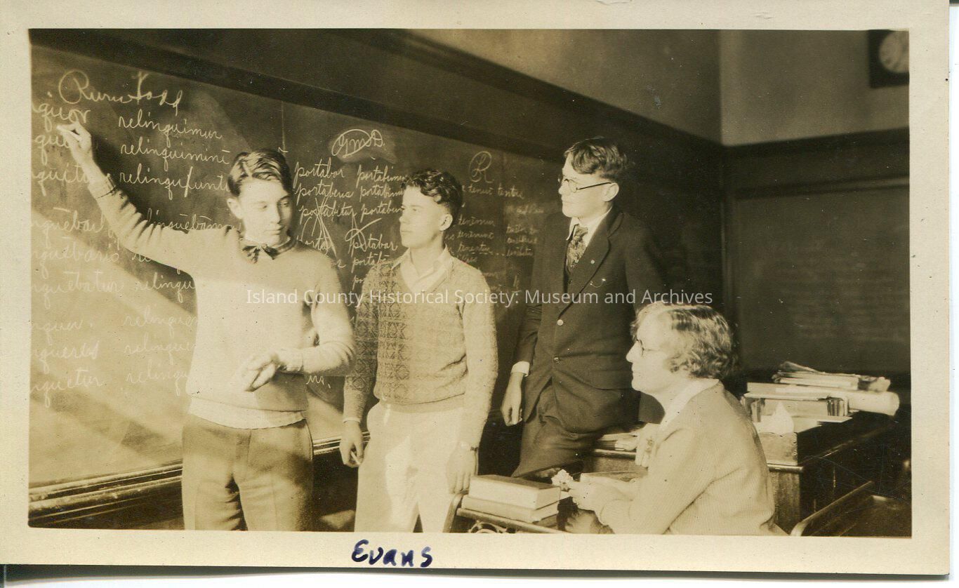 A black and white photo of two young men, a man and a woman. One young man (plain sweater) is writing words on the blackboard with chalk. The adults are both wearing glasses. On the bottom: "Evans"