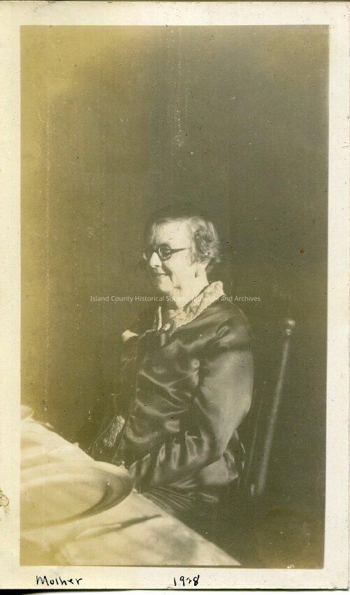 A black and white photo of woman sitting at a dining table in a chair. She wears glasses. Lace collar and satiny jacket. On the bottom: "Mother 1928" Lillian McKeen Butters Kellogg