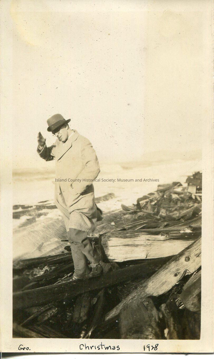 A black and white photo of a man at the beach, standing on driftwood. Wearing a hat, coat, has glasses. His right hand is raised. On the bottom: "Geo. Christmas 1928" Related to 2015.074.230 and .231.