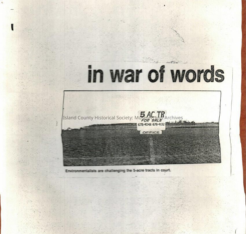 One picture entitled "in war of words". There is a subtitle under the photo that says, "Environmentalists are challenging the 5-arce tracts in court". The photo is of Smith's farmland with a sign advertising the sale of 5-arce tracts with the phone numbers "678-4048" and "678-4132". The farmland in the photo appears to be tilled but not planted.
