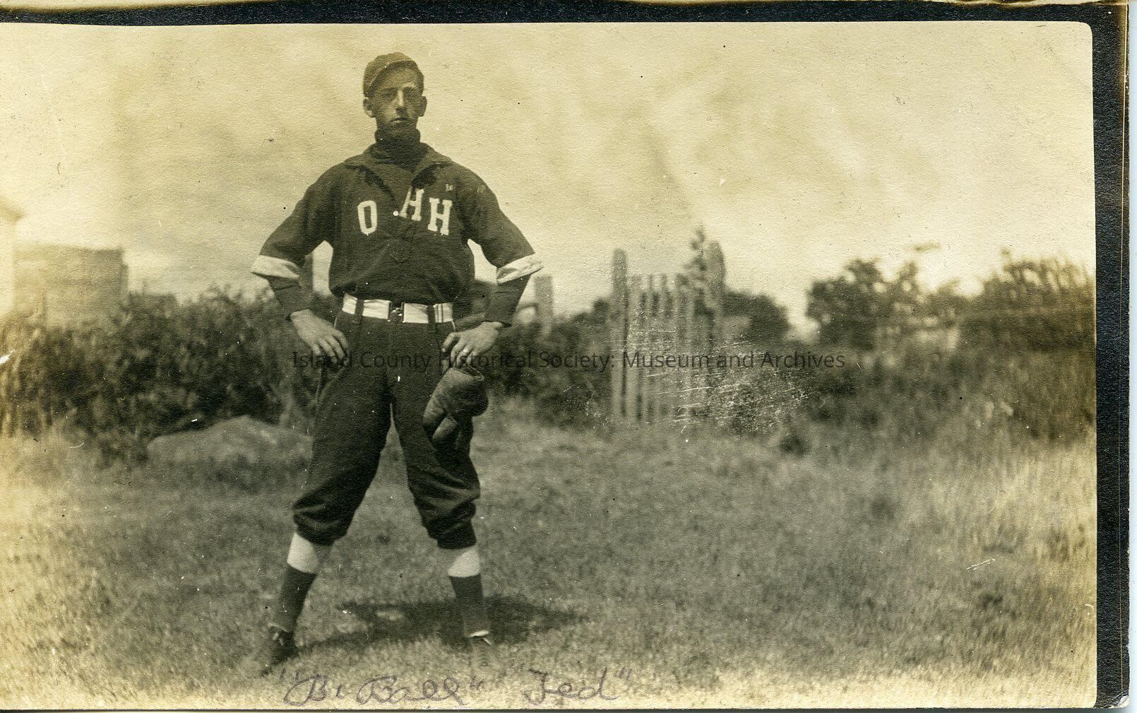 A photo of a man standing outside on grass in a baseball uniform. Handwritten on the back is "Ted Hill. Harvey and Ted Hill Families."Made/Created