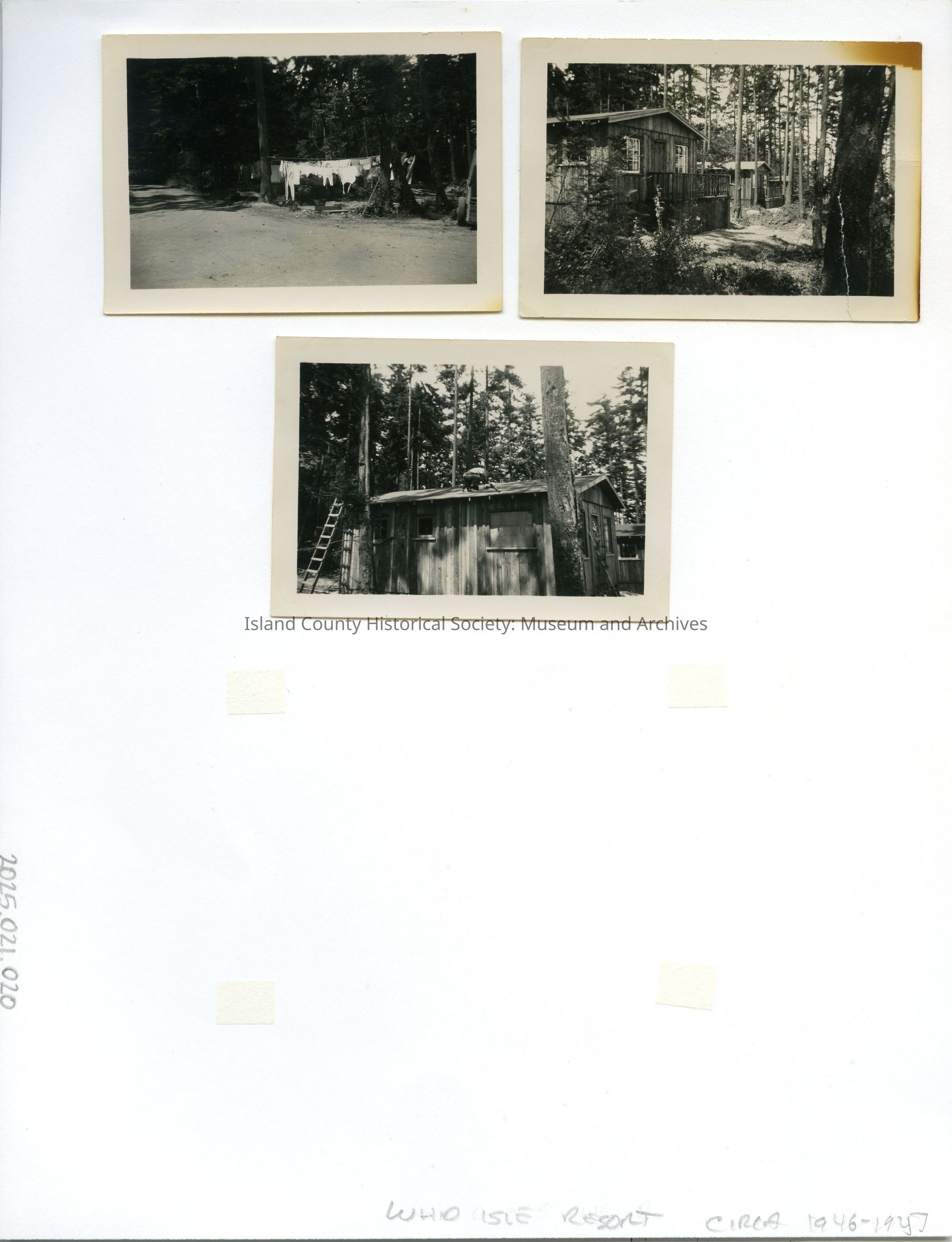 A scrapbook page containing three photos of Whid-Isle Resort, ca. 1946-1947