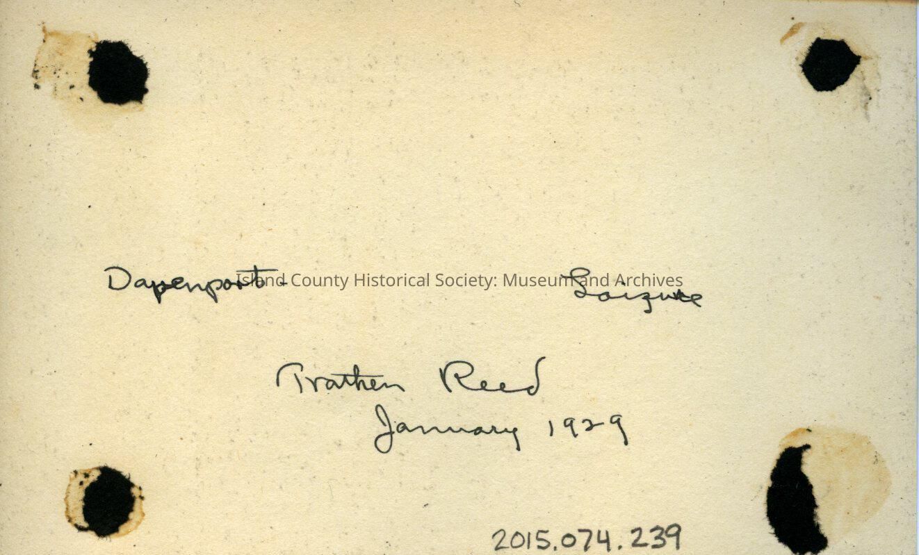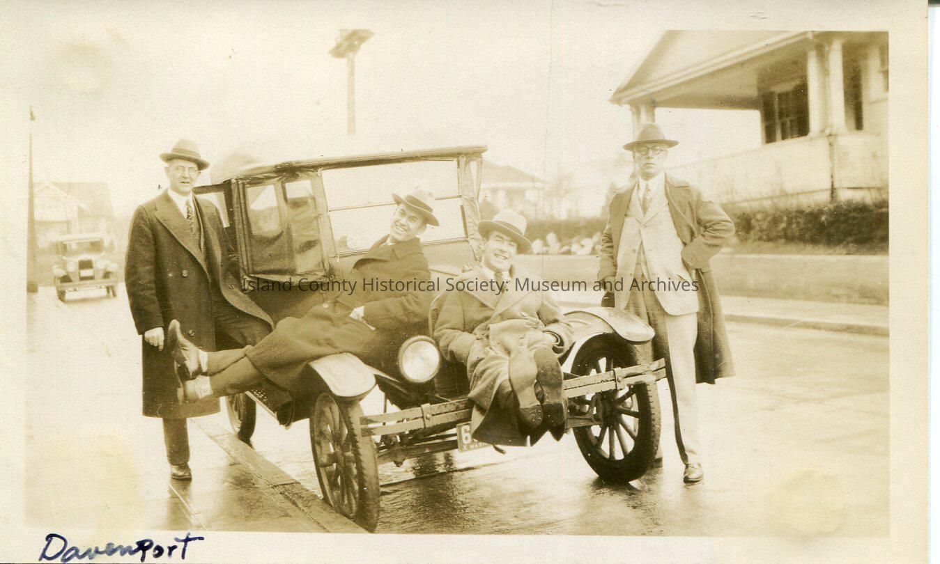 A black and white photo of four men and a car in front of a house with a porch. The car is parked on a paved road at a curbed sidewalk. The man on the passenger side has one foot on the running board, the second is lying sideways on the car front fender and hood, the thrid is light on the front of the car with his feet out in front, the fourth is beside the left fender. All are wearing suits, overcoats and hats, and probably all have glasses. Washington tag. A second car in the background. On the bottom: "Davenport", on the back: "Davenport, Laizue (not sure of the letters) Trathen (?) Reed, January 1929"Made/Created
