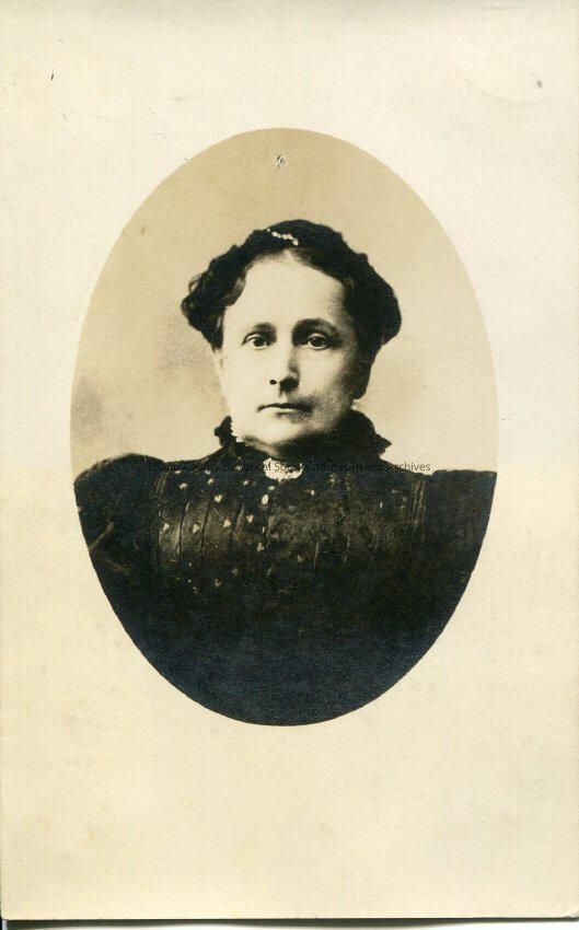 A black and white photo of a woman - a portrait - oval. She is wearing a high-collared outfit with an oval pin under her chin, puffed sleeves. The postcard type is Artura, dated 1908/1910-1924. Oella Brown Butters, 2nd wife of James Butters.