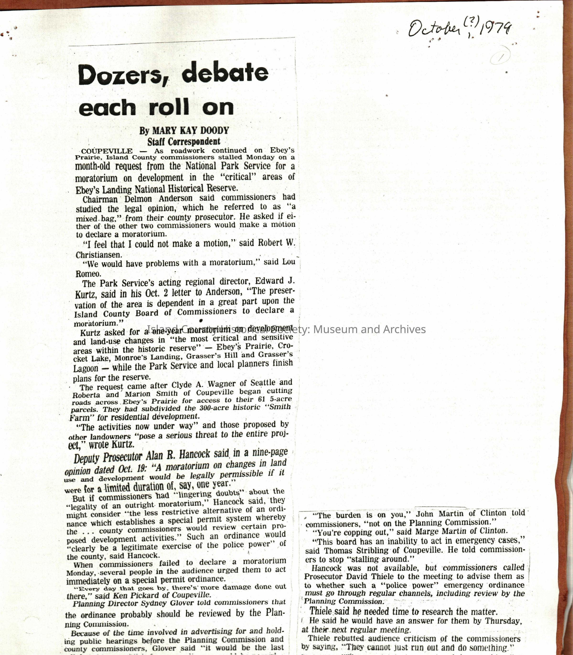 An article entitled, "Dozers, debate each roll on" by Mary Kay Doody. The article discusses the roads being built on Ebey's Prairie by the owners of the Smith farm. The Park Service's acting regional director, Edward J. Kurtz "asked for a one-year moratorium on development and land-use changes in 'the most critical and sensitive areas within the historic reserve'". However, the process is slower than the road construction and this upset many people. Prosecutor David Thiele "rebutted audience criticism of the commissioners by saying, 'they cannot justt run out and do something'".