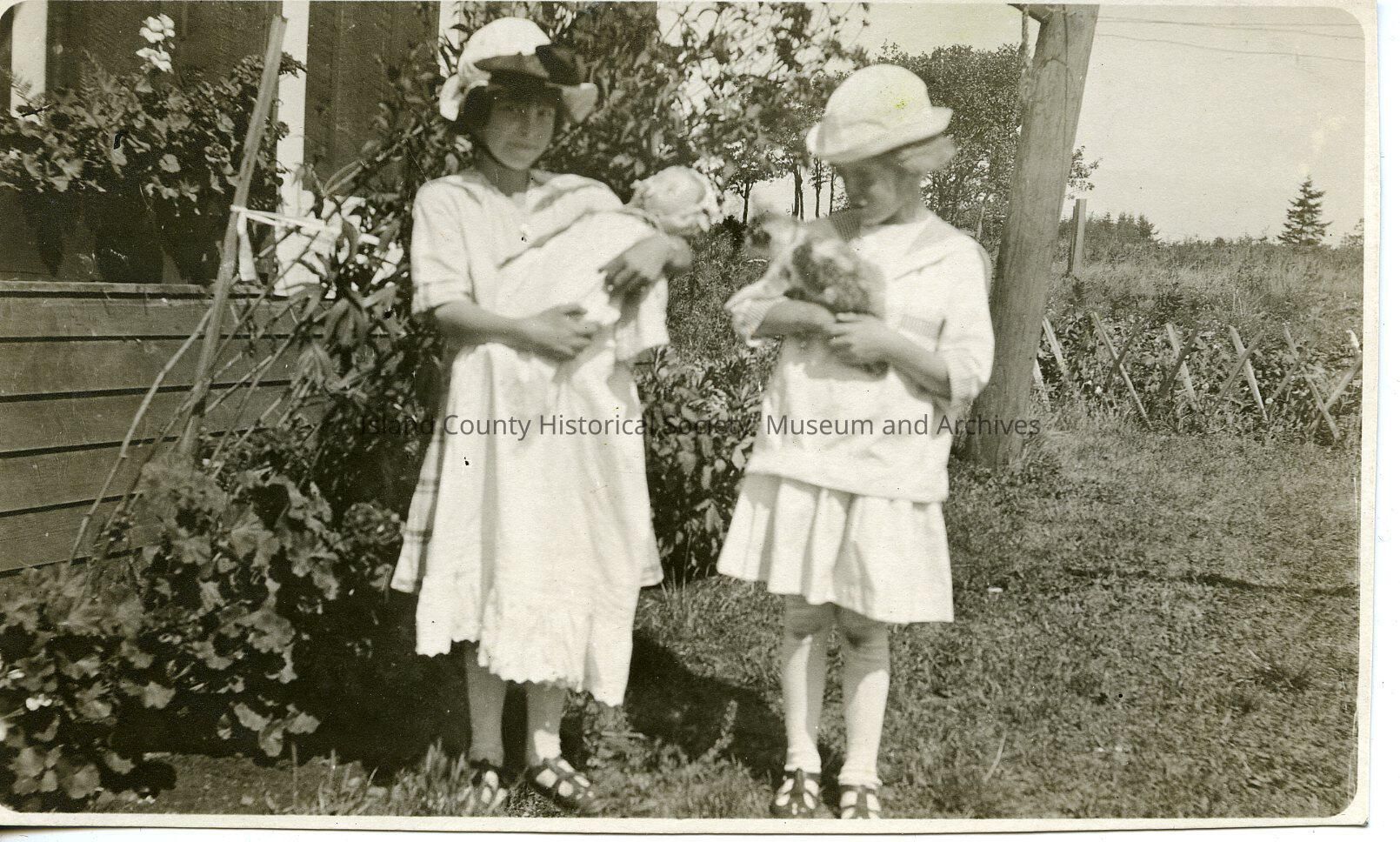 A photo of two young girls standing outside a home. One holding a doll and the other holding a cat. Handwritten on the back is "Phyllis Lorette and Puffball. Harold and Ted Hill families."Made/Created