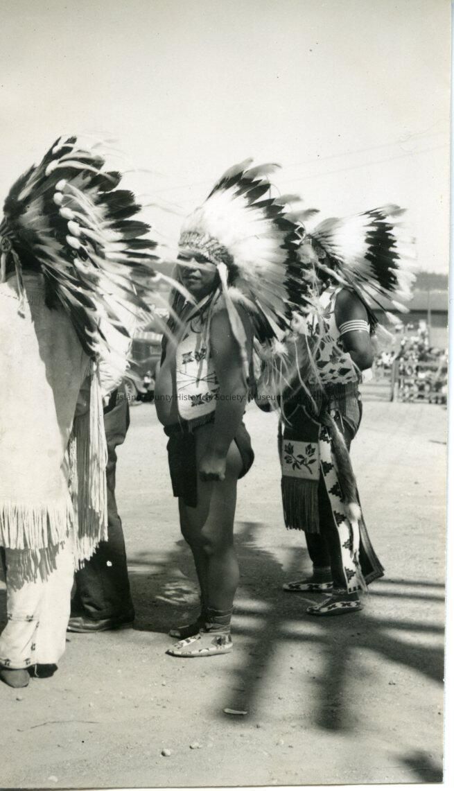 Black and white photograph of three Native American men in ceremonial garb at a 1930s-40s water festival. They stand close together, only one of their faces is visible to the camera, in a wide open space.