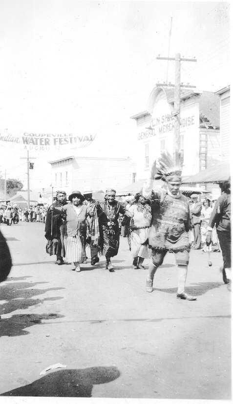 Sepia photograph of the Penn Cove Water Festival Parade (1934? date written on back). Native American men and women, some in more "western" clothing and others in "traditional" attire, walk together down a street with bystanders watching on either side. Some shops are visible, including Sill's General Merchandise store. Telephone poles line the street sides. A banner is stretched across the street: "Coupeville Indian Water Festival Aug 10, 11 and 12"Collection