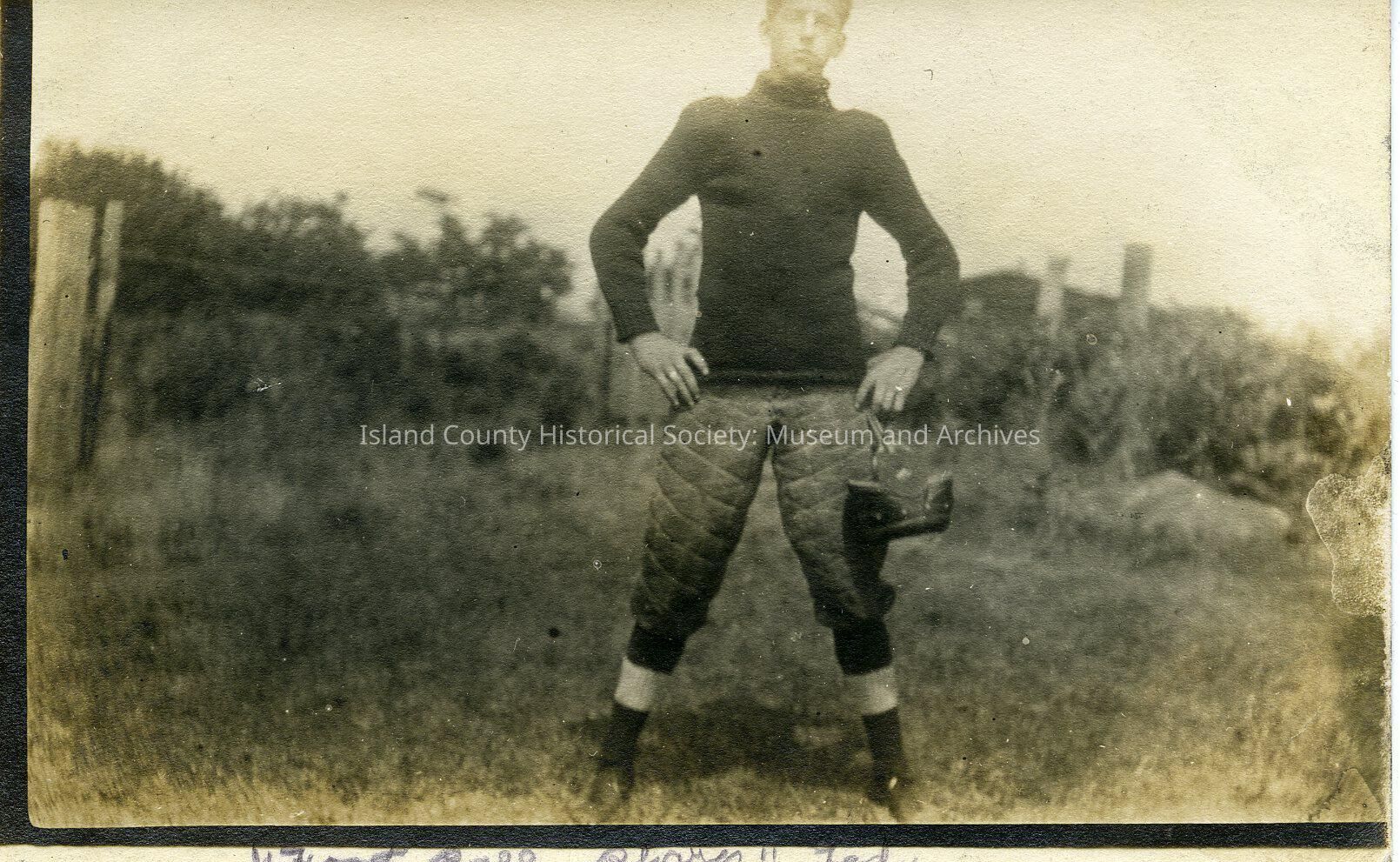A photo of a man standing outside in a football uniform. Handwritten on the front is "Foot Ball Player, Ted." Handwritten on the back is "Ted Hill."Made/Created