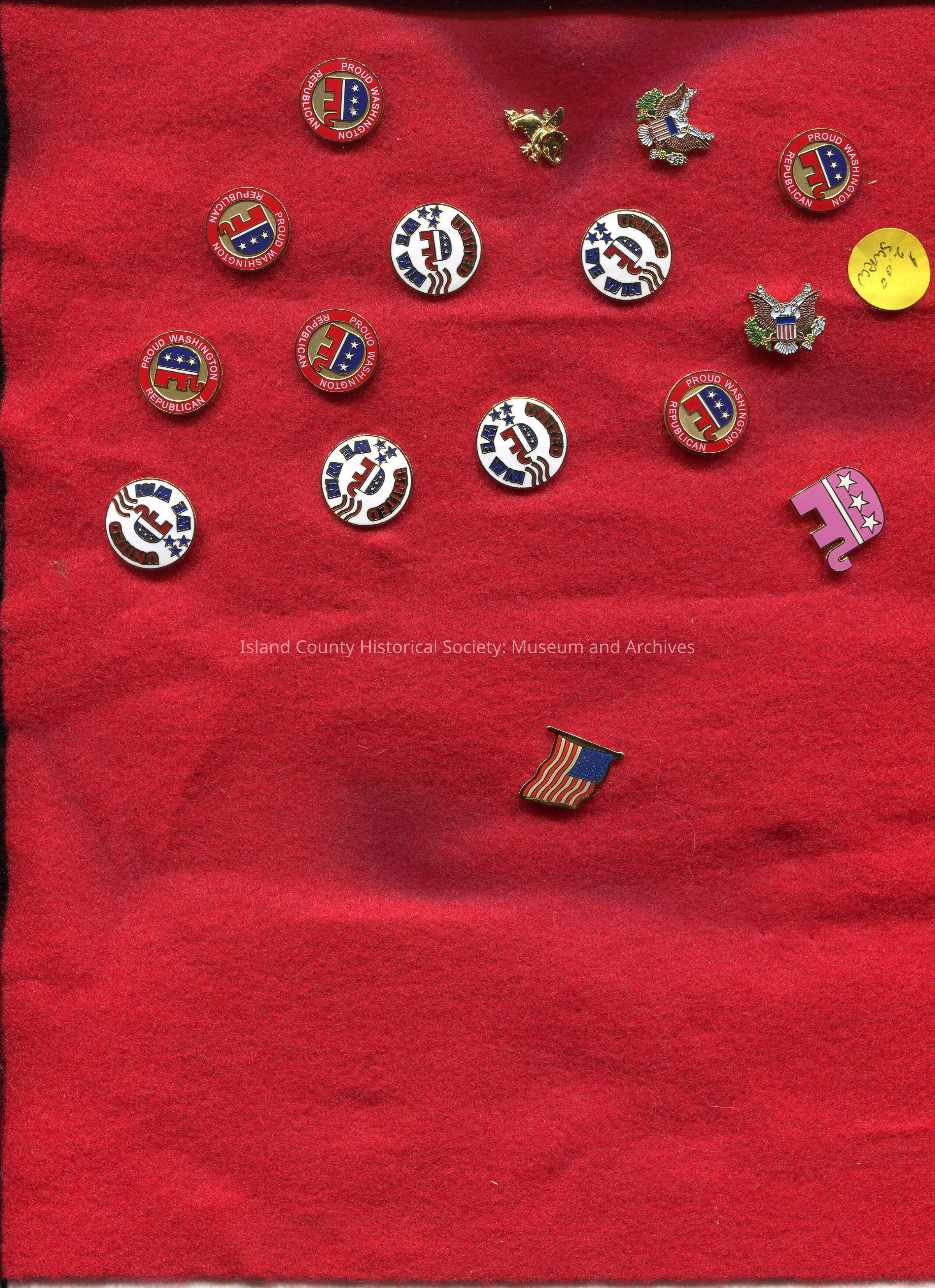 A piece of red felt with 16 pins on it. Six of the pins are the same and they say, "Proud Washington Republican". Five other pins are the same and they say, "United We Win".Archive Details