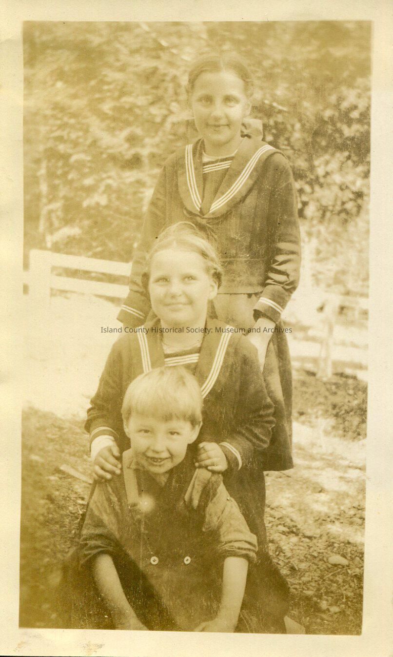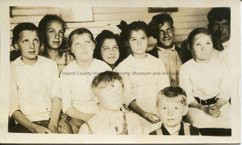 A black and white photo of 10 (ten) children in three rows all but one looking up. Six are girls, four boys.