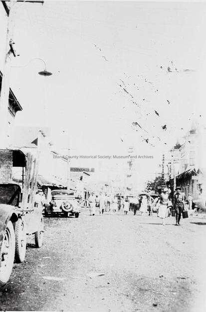 A black and white/sepia photo of Coupeville Front Street Water Festival (on photo is is dated as 1830, but this can't be possible, so probably 1930s). Banner can be seen and ferris wheel in the background.Collection