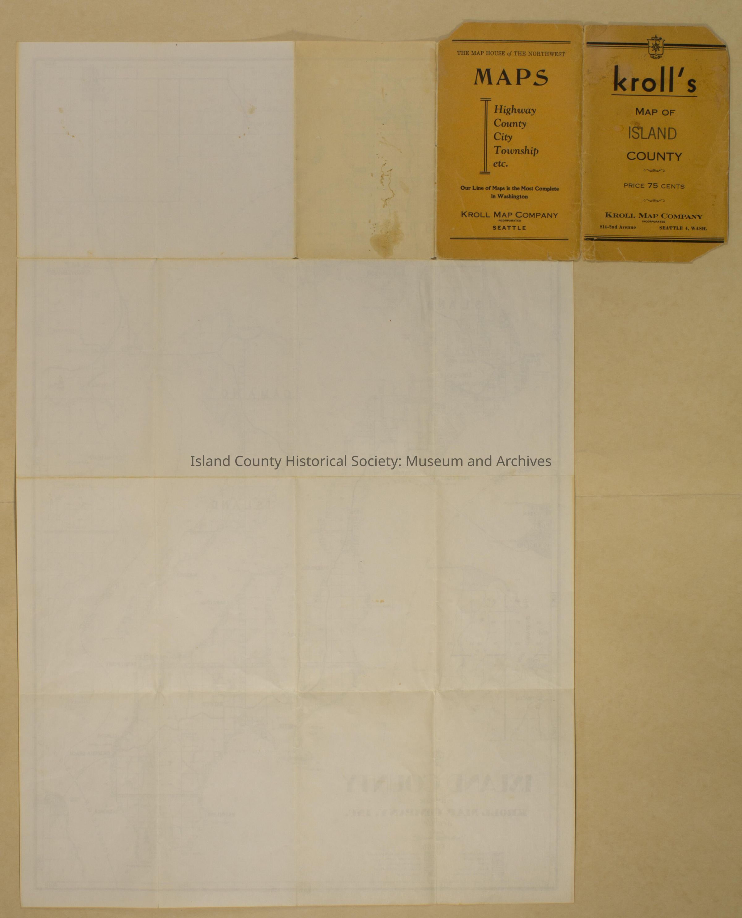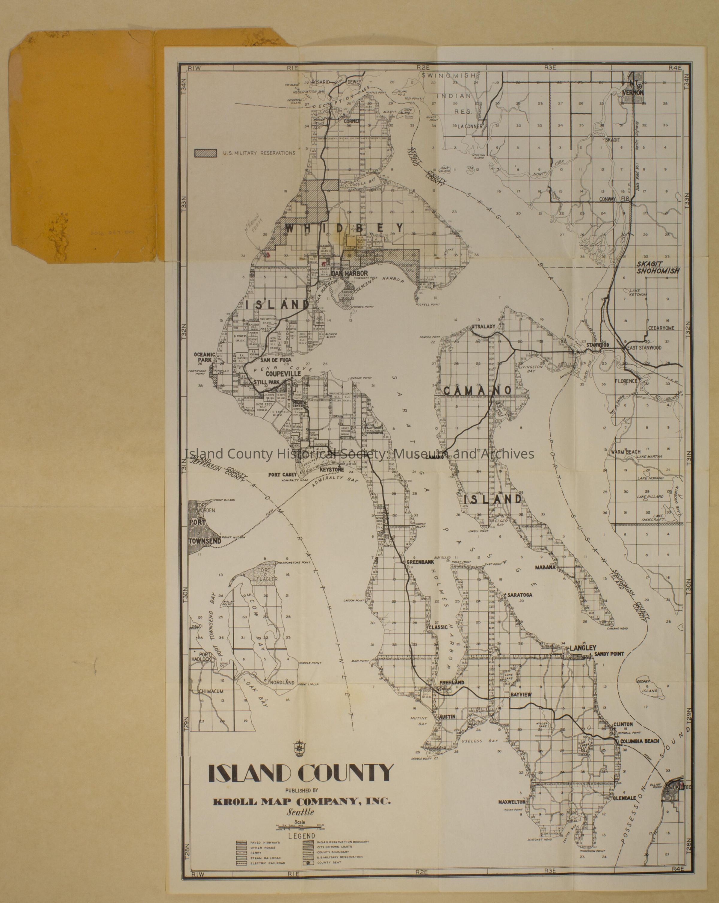 Kroll's Map of Island County. Kroll Map Company 814-2nd Ave, Seattle 4, Wash. Unfolds into a map showing plots of land and key features incl. county seat, US military reservation, boundaries of city, town, county and Indigenous, roads and railroads and ferrylines. Some stains. Pencil markings noting areas of McKeown's farm and Graham's. These are also denoted in red crayon. Includes beginnings of the Snohomish and Jefferson counties. Includes Mukilteo, Port Townsend, Chimacum, Rosario, Lake Goodwin, Cedar Home, Mount Vernon. No date is given, but the company was est. in 1911 and notes on their website suggest this map was produced in 1958 or thereabouts.