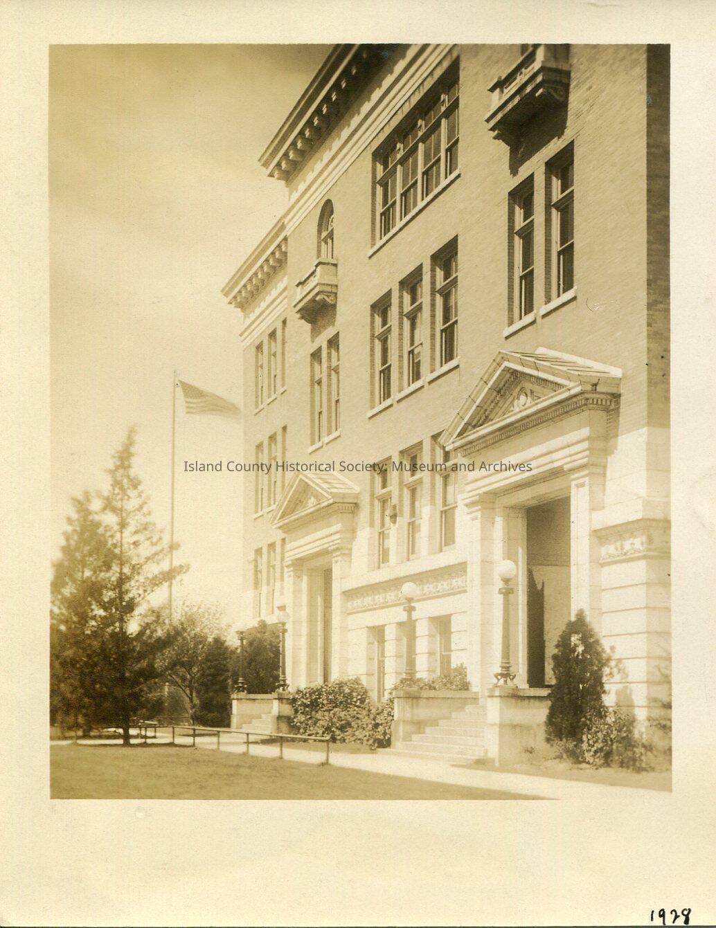 A black and white photo of a four-story building, two porticoed entries, each with stairs and poles with lights on them on the stairs. Flag and flagpole. On the bottom: "1928"
