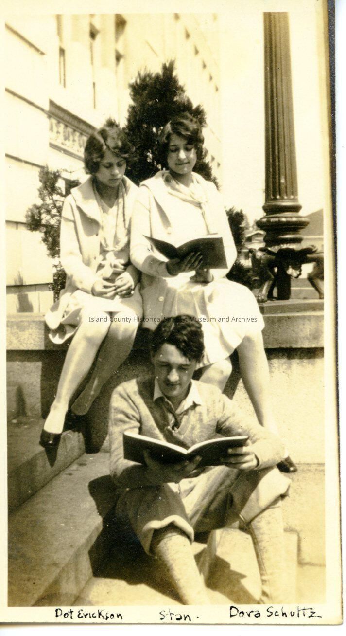 A black and white photo of two young women and a young man on the stairs of a large building, one woman holding a book while the other looks on, the young man in front of them is reading a book. On the bottom: "Dot Erickson Stan Dora Schultz".