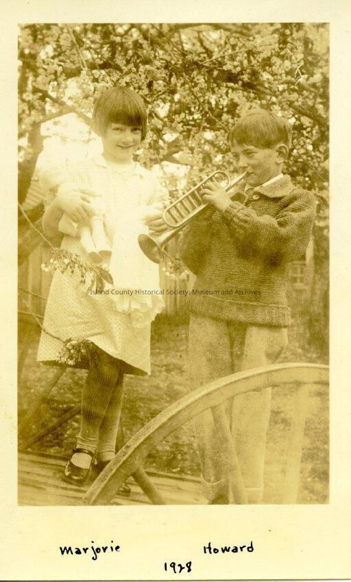 A black and white photo of a boy and a girl under trees, standing on possibly a cart with a wheel. She is holding a doll and he is playing a toy trumpet (has eight keys). On the bottom: "Marjorie Howard 1928". On the back: Marge & Howard Weidenbach".