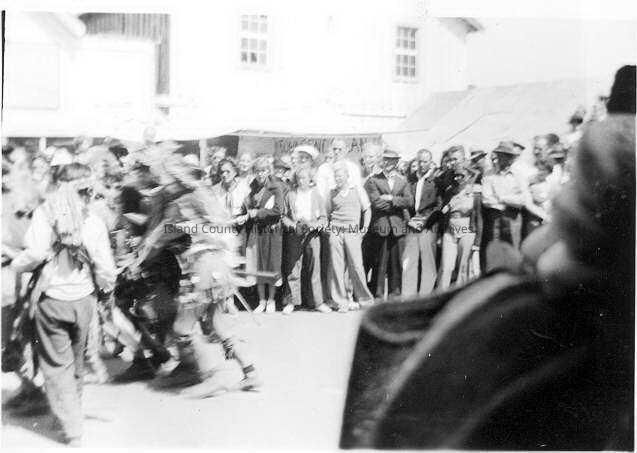 A sepia/black and white photograph of a Native American dance during the 1935 (Aug 11) water festival. A crowd of people watch the dance, standing in a circle. The blurred figures of Native Americans are captured on the left of the photo.Collection