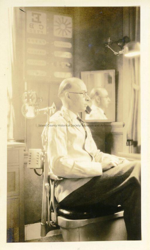 A black and white photo of a man in a doctor's office, mirror behind him, he is sitting on an examiner's chair, wearing glasses, lab coat.