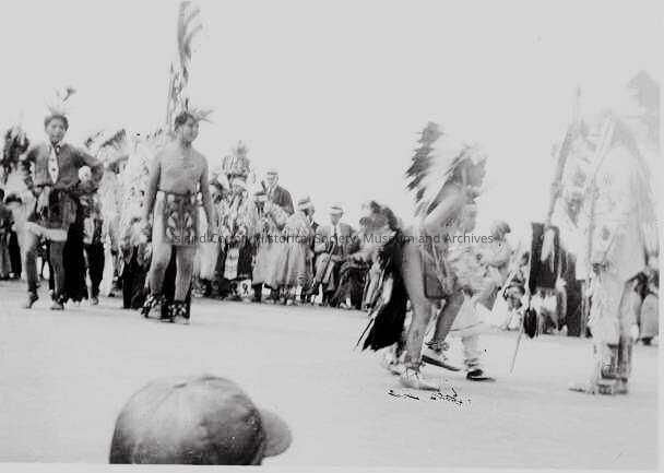 A sepia/black and white photograph of Native Americans dancing at Coupeville water festival 1935. Spectators gather, sitting or standing, in a circle around the dancers. Most of the dancers are boys, mostly clad in headdresses, loincloths and sandals with bells around the ankles. Two boys stand across from an adult male, fully clad and a more elaborate headdress and pole, whilst other boys wait some distance away perhaps stamping their feet.Collection