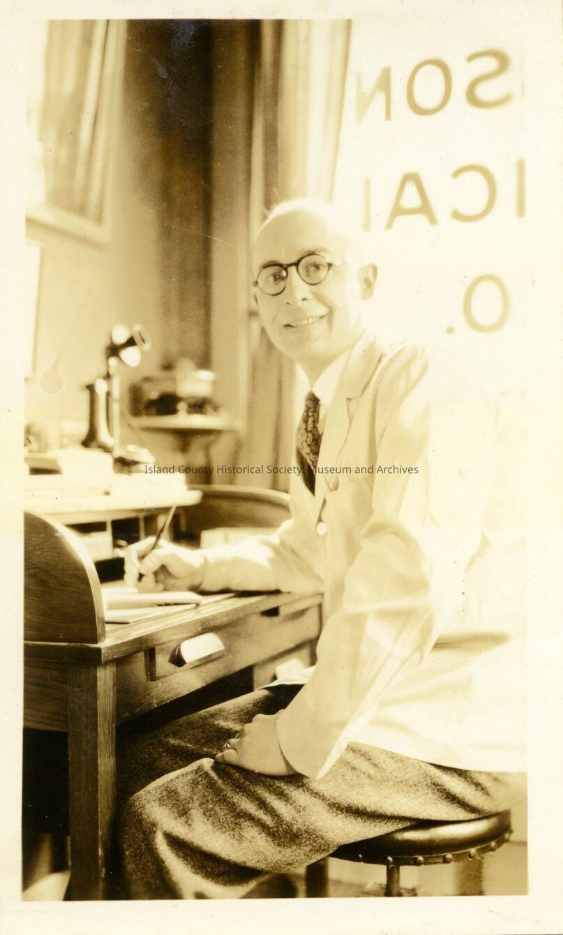 A black and white photo of a man sitting in an office on a stool at a small roll-top desk with a telephone. There is writing on the window behind him. He is wearing glasses and a lab coat. Ivan Kilgore Related to 2015.074.254.