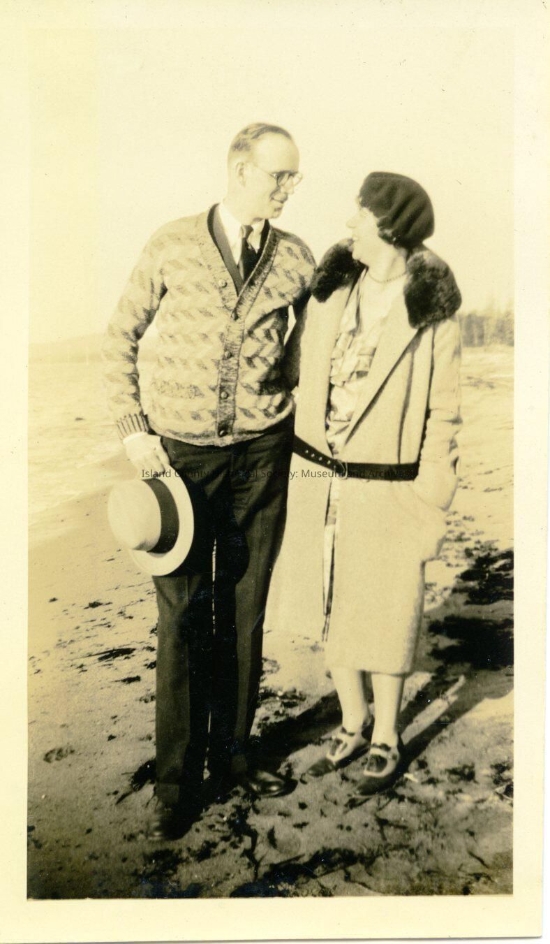 A black and white photo of a man beside a woman. he is wearing a patterned cardigan ahd holding a hat. She has on a fur-collared coat and beret. He is wearing glasses. It looks like they are standing at the beach. Harold and Betty Kellogg