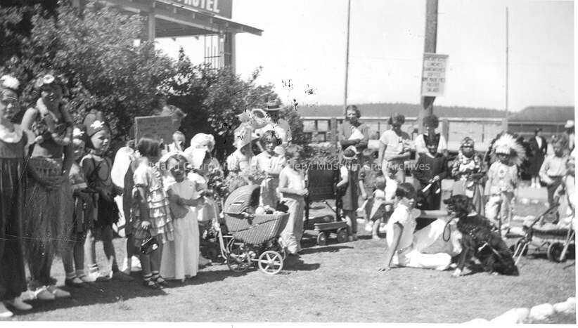 Black and white photograph showing crowd of mostly child, some standing up in a line, whilst others sit on the ground. There is a pram in the middle of the photo. They appear to be outside the Starwana Hotel with the menu attached to a phone pole in the background. During a parade at a 1940s(?) water festival.Collection