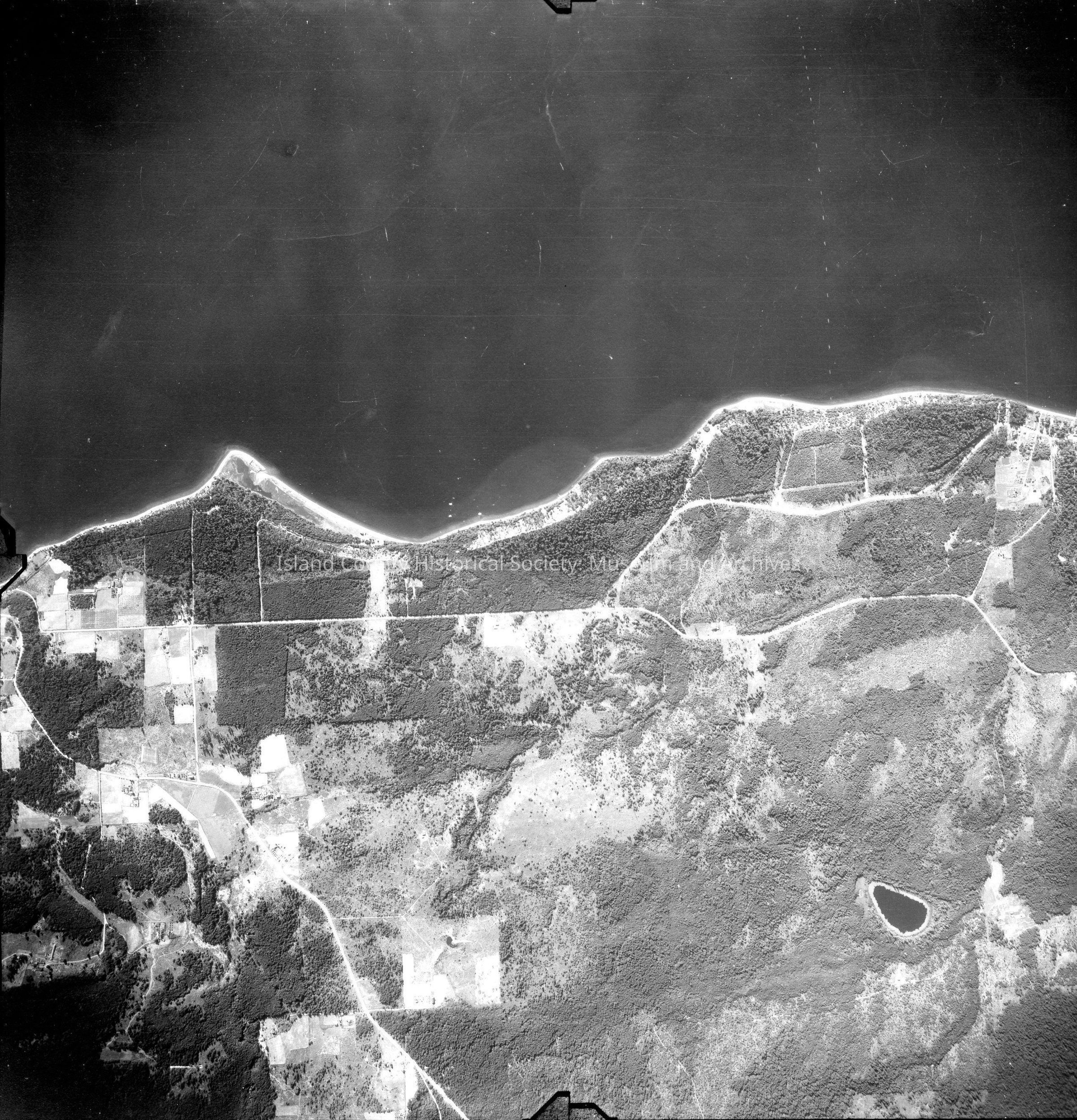 About half the image is water while the other half is land. Carp lake and Onamac Point. Main roads and farm lane.