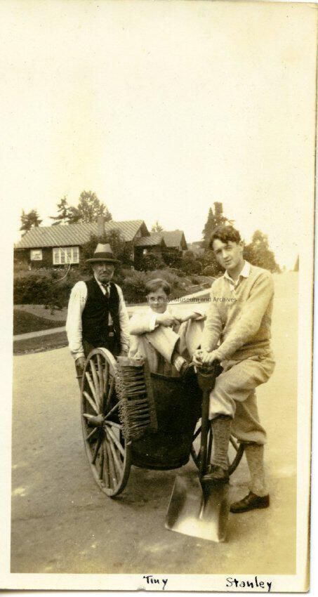 A black and white photo of two young men and an older man. The older man, wearing a hat, is behind a two-wheeled cart, one young man is sitting in the cart and the other is holding a shovel, with his left foot on the shovel blade. On the bottom: " Tiny Stanley"Made/Created